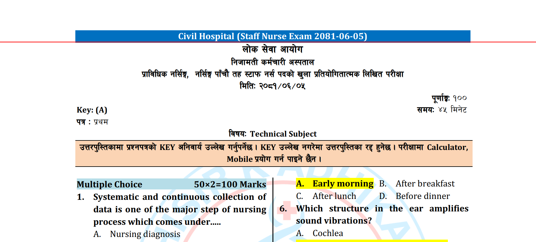 Civil Service Hospital Staff Nurse Loksewa Questions Solutions (2081-06-05)