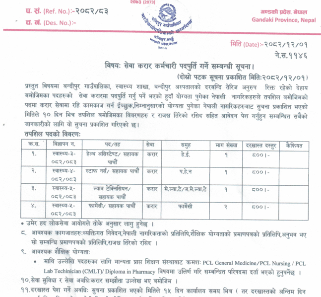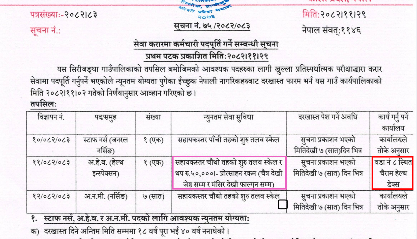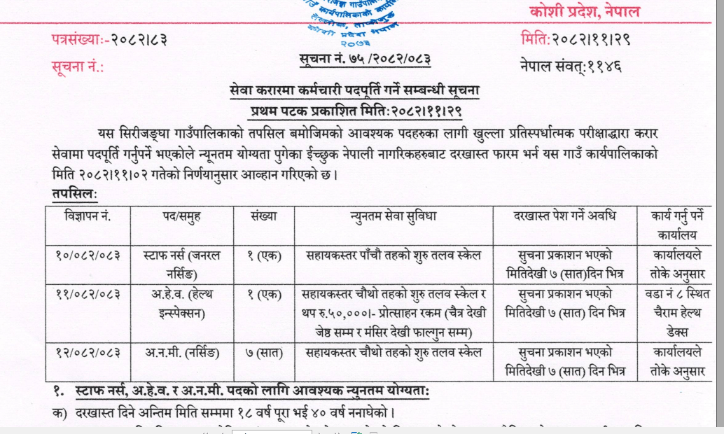 सिरीजङ्घा गाउँपालिका ताप्लेजुङ्गमा Staff Nurse, AHW, ANM आवश्यकता !