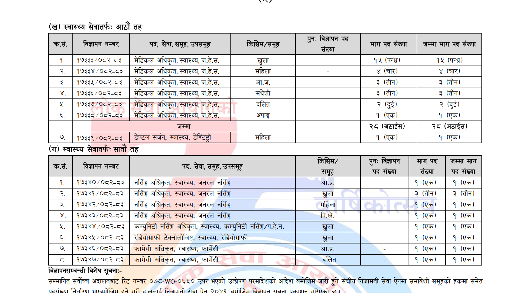 निजामती सेवाका राजपत्रांकित तृतीय श्रेणी (प्राविधिक), तथा स्वास्थ्य सेवाका आठौं/सातौं तह (बढुवा, आ.प्र., खुला तथा समावेशी) पदहरूकाे विज्ञापन सम्बन्धी सूचना।
