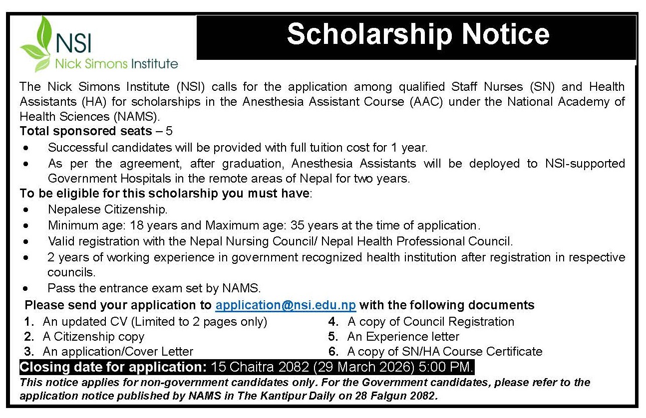 Scholarship Notice: Nick Simons Institute (NSI) invites applications for scholarships in the Anesthesia Assistant Course