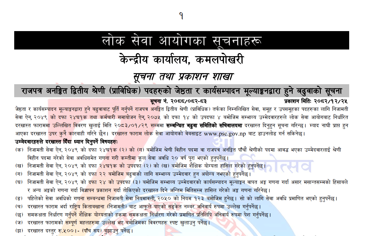 केन्द्रिय लोक सेवा आयोगको रा.प.अनं. द्वितीय श्रेणी, खरिदार वा सो सरह (प्राविधिक) र स्वास्थ्य सेवाको चौथो तहका पदहरुको बढुवा, आ.प्र. र खुला तथा समावेशी पदको विज्ञापन
