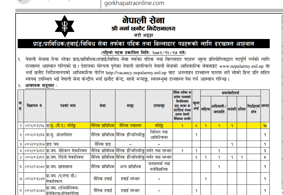 नेपाली सेना प्राविधिक (HA/CMA, Staff nurse, Dental)/हवाई/विविध सेवा तर्फका पदिक तथा बिल्लादार पदहरुको लागि दरखास्त आव्हान