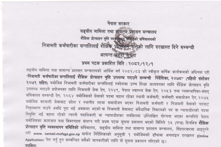 Notice from the MoFAGA for Application for Educational Incentive Scholarship for Children of Civil Servants