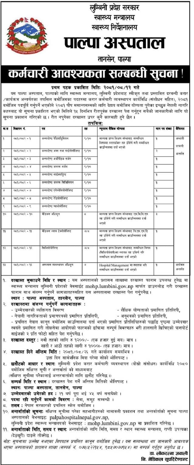 पाल्पा अस्पतालमा कर्मचारी आवश्यकता सम्बन्धी सूचना !
