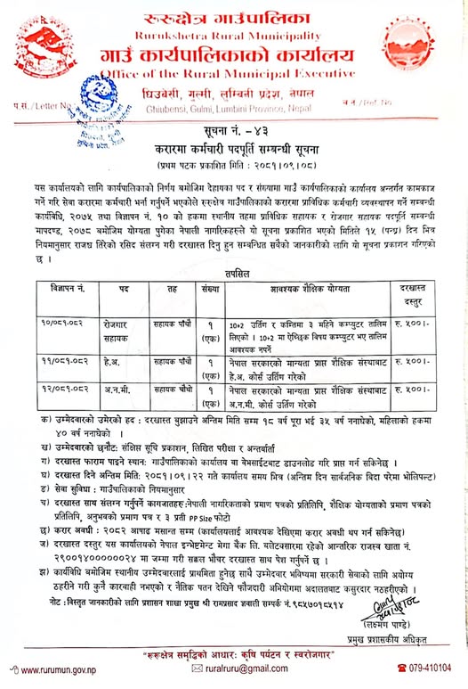 रुरुक्षेत्र गाउँपालिका गुल्मीमा कर्मचारी आवश्यकता सम्बन्धी सूचना