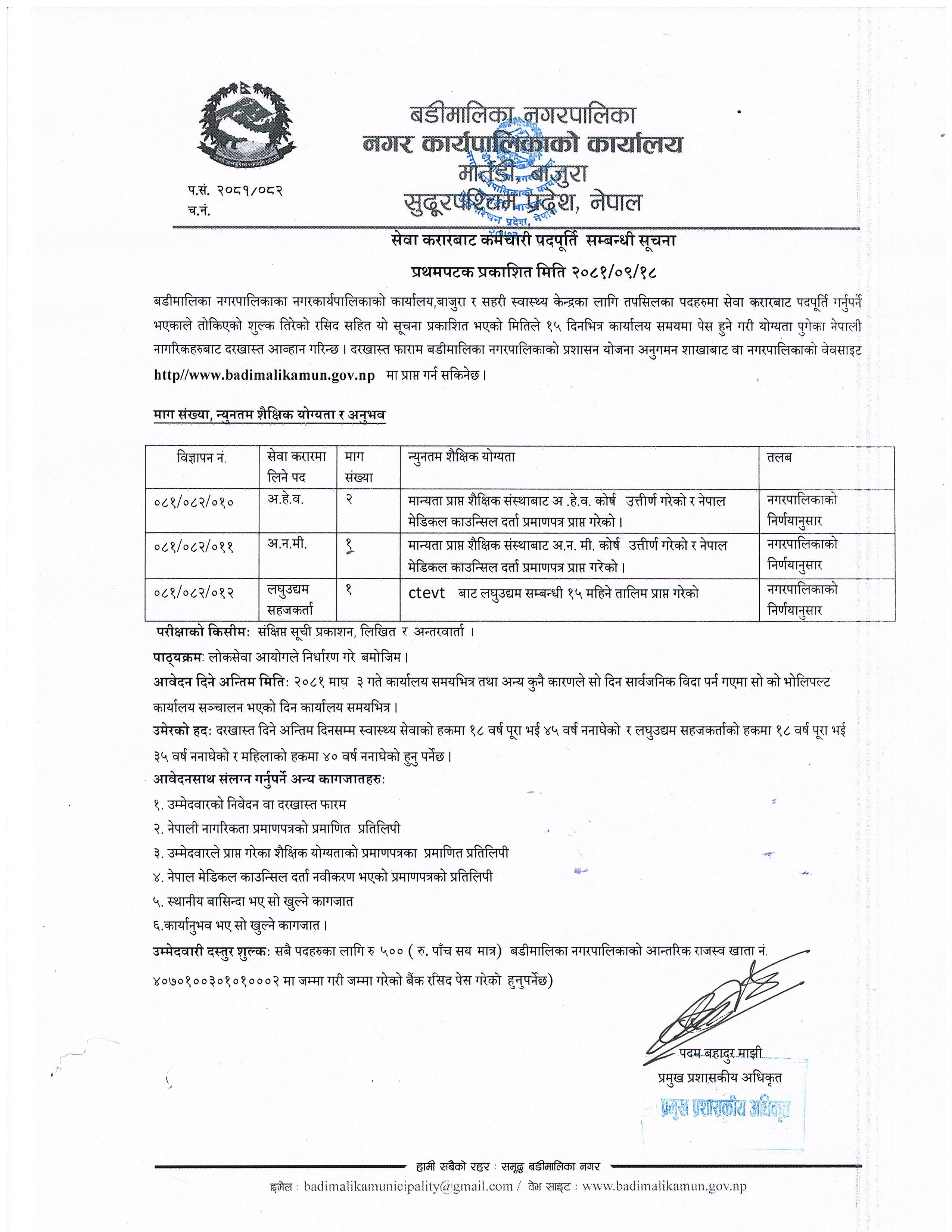 बडीमालिका नगरपालिका बाजुरामा कर्मचारी आवश्यकता सम्बन्धी सूचना