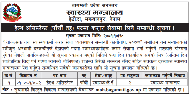 बागमती प्रदेश स्वास्थ्य मन्त्रालयमा हे.अ.आवश्यकता सम्बन्धी सूचना