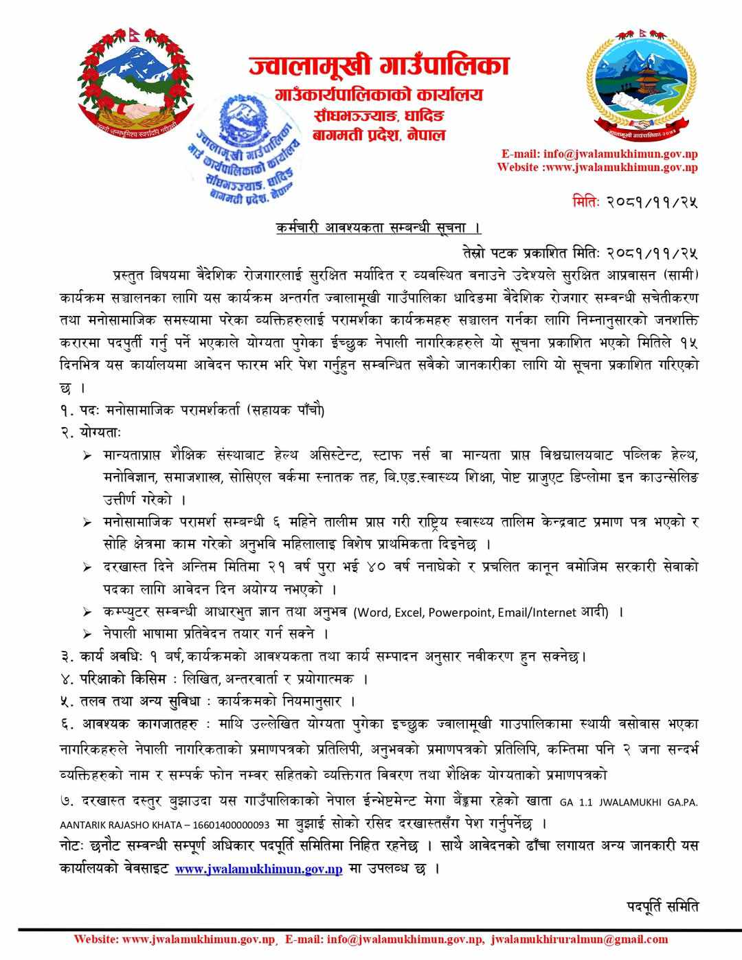 ज्वालामूखी गाउँपालिका धादिङमा मनोसामाजिक परामर्शकर्ता आवश्यकता सम्बन्धी सूचना