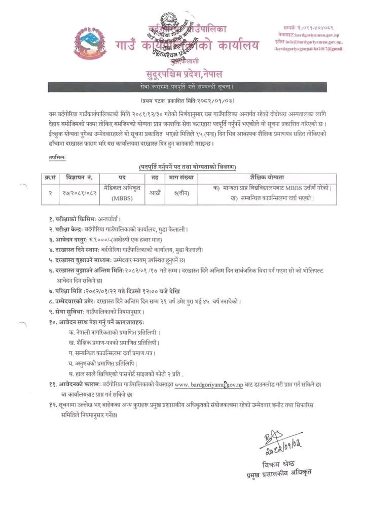 बर्दगोरिया गाउँपालिकामा मेडिकल अधिकृत आवश्यकता सम्बन्धी सूचना