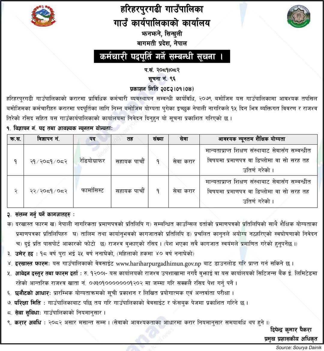 हरिहरपुरगढी गाउँपालिकामा कर्मचारी आवश्यकता सम्बन्धी सूचना