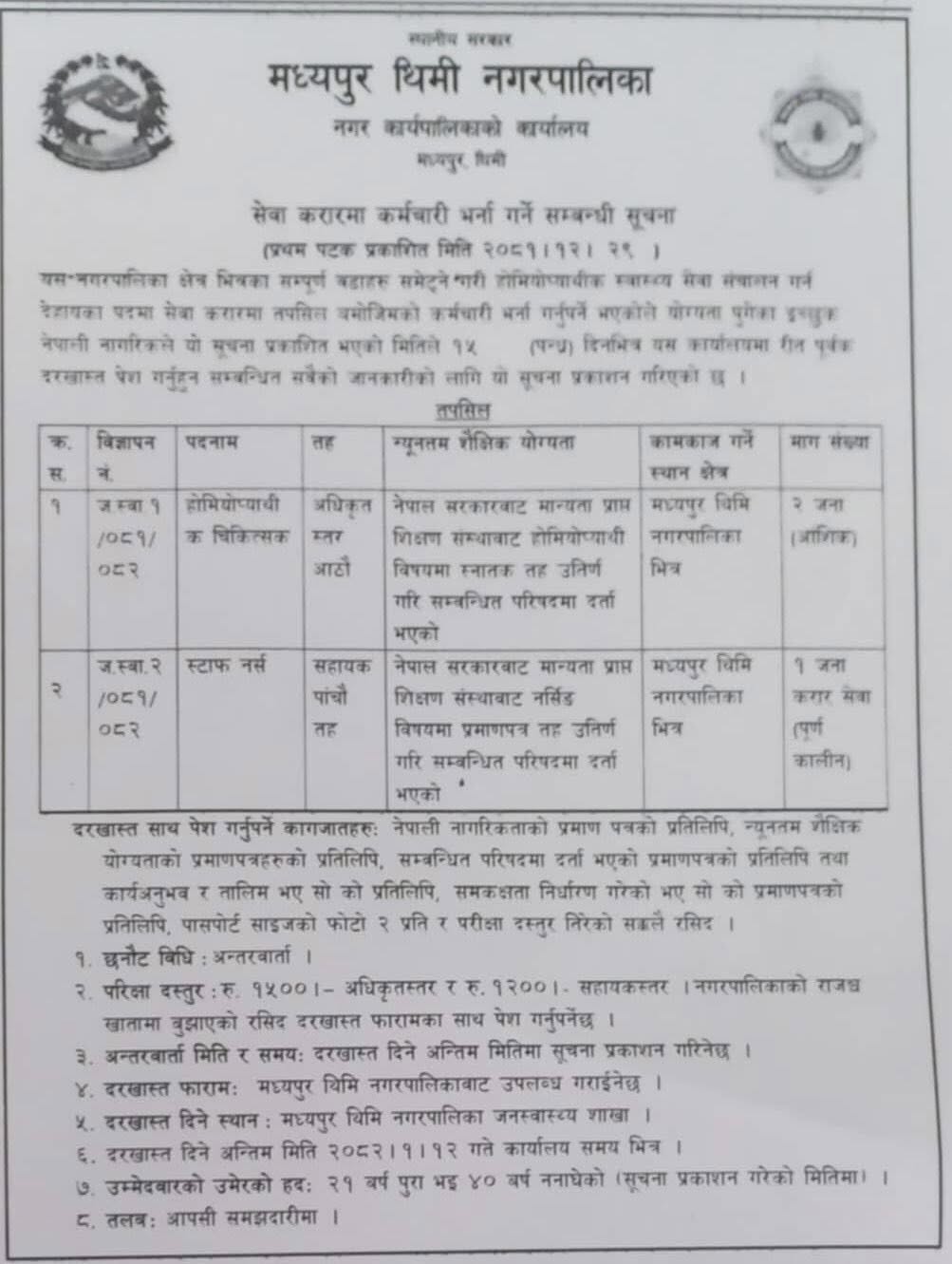 मध्यपुर थिमी नगरपालिकामा चिकित्सक र स्टाफ नर्स आवश्यकता