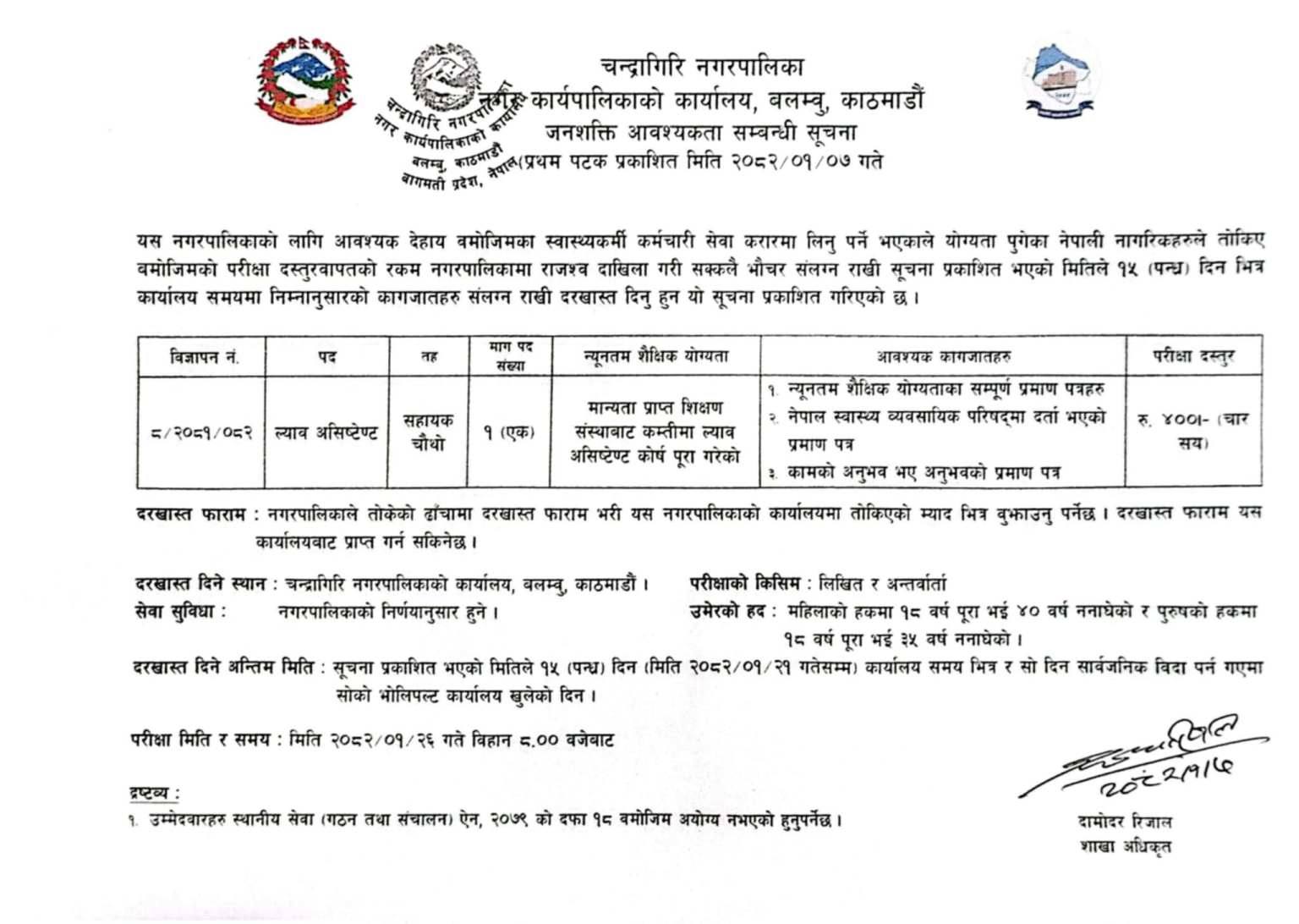 Chandragiri Municipality Vacancy for Lab Assistant