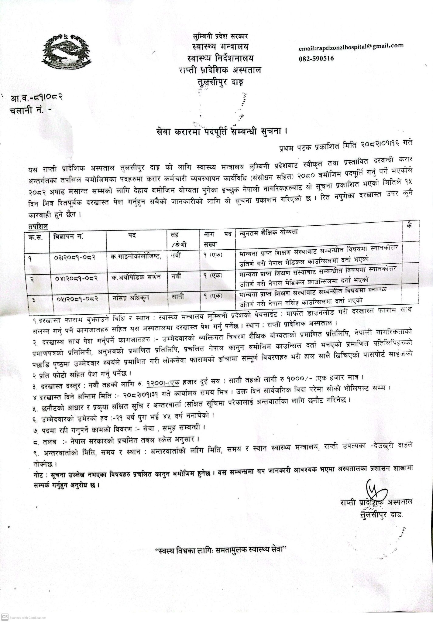 राप्ती प्रादेशिक अस्पताल, तुलसीपुर दाङमा कर्मचारी आवश्यकता