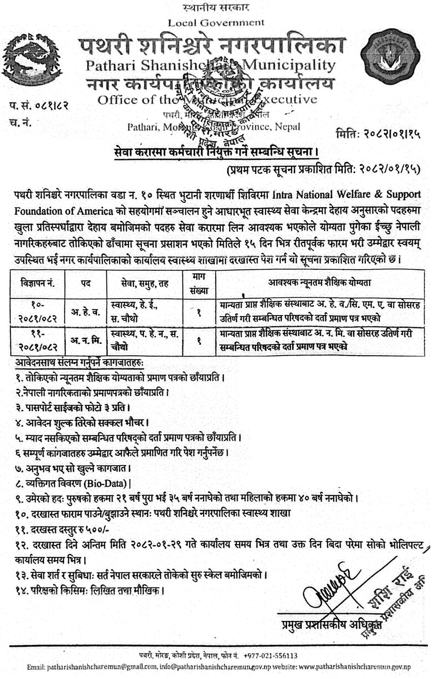 Pathari Shanishchare Nagarpalika, Morang Vacancy for AHW and ANM