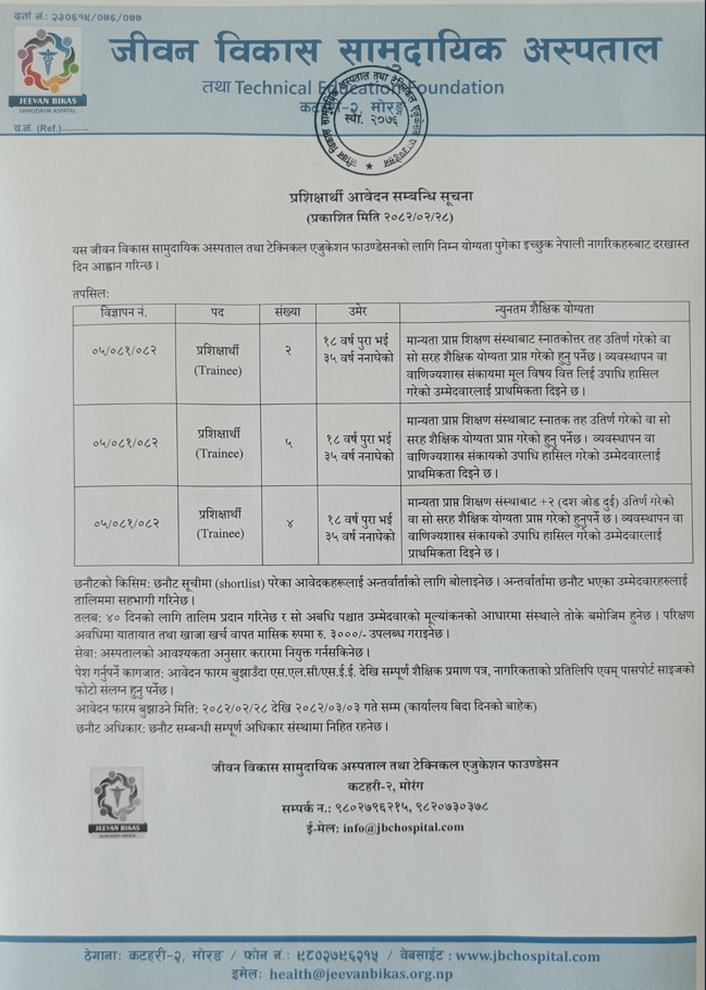 Jeevan Bikas Community Hospital Vacancy for Trainee