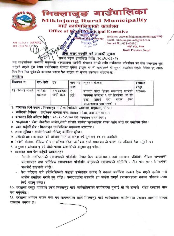 मिक्लाजुङ गाउँपालिकामा फार्मेशी सहायक आवश्यकता सम्बन्धी सूचना