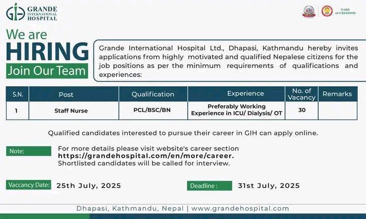 Staff Nurse vacancy (30) at Grande International Hospital, Kathmandu