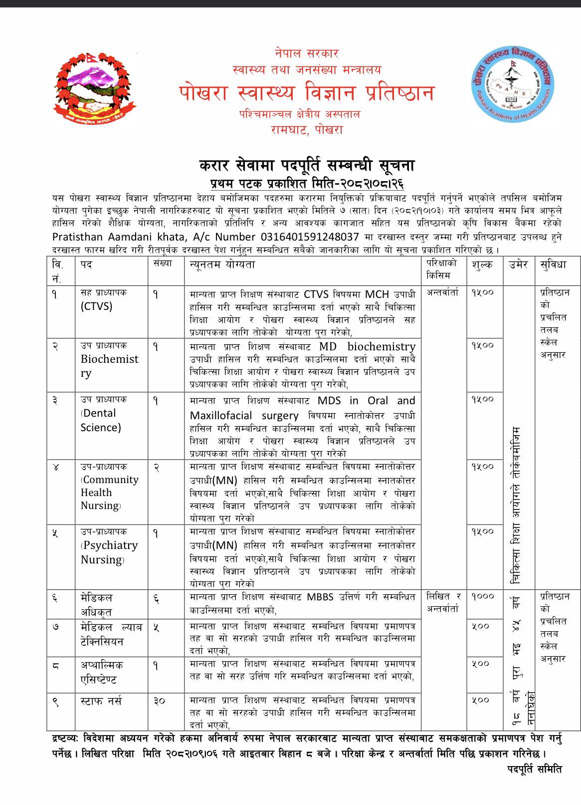 पोखरा स्वास्थ्य विज्ञान प्रतिष्ठानमा ३० जना स्टाफ नर्स सहति ४८ जना कर्मचारी आवश्यकता