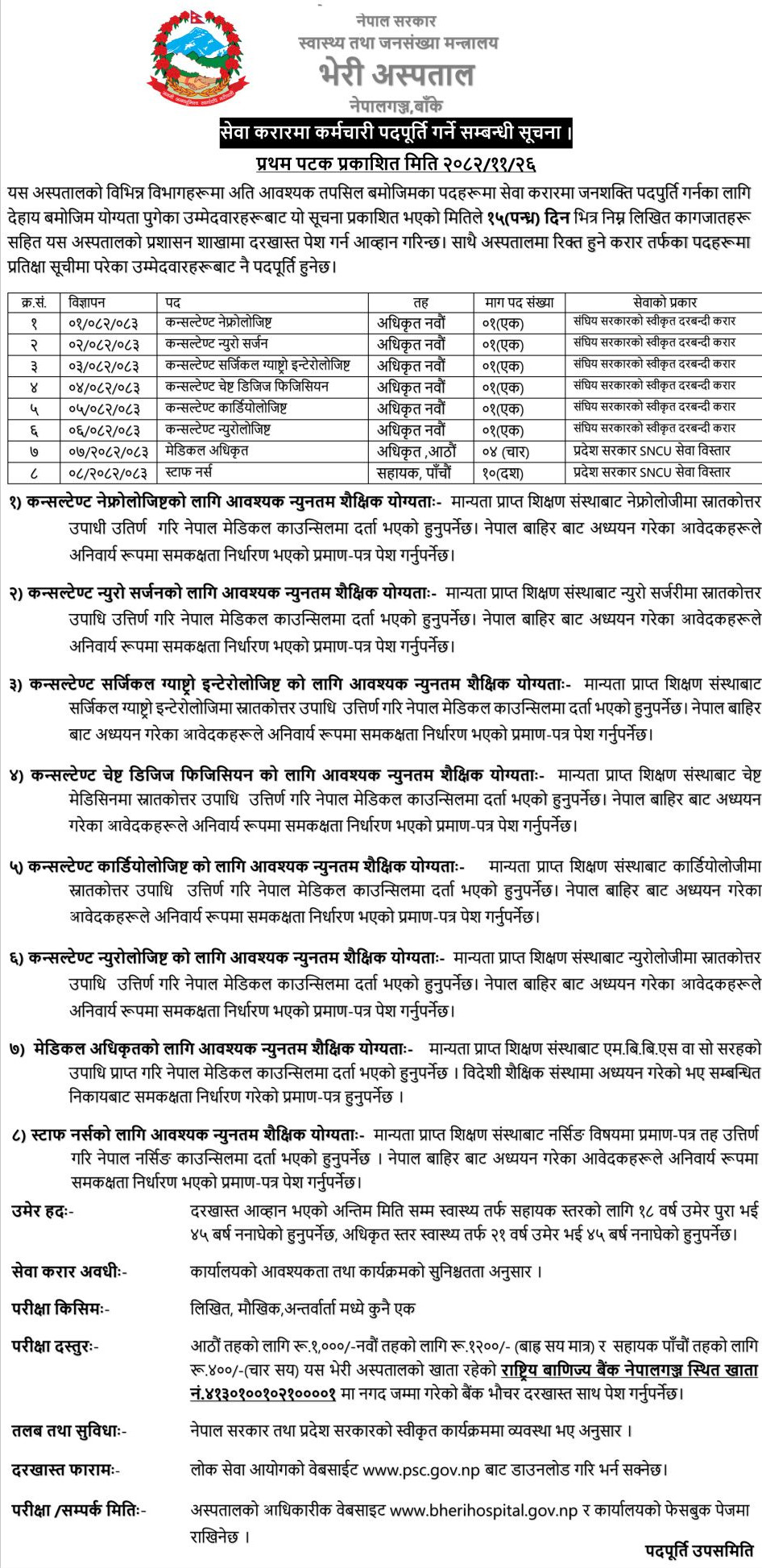 भेरीअस्पताल नेपालगन्जमा १० जना स्टाफ नर्ससहित चिकित्सक आवश्यकता सम्बन्धी सूचना