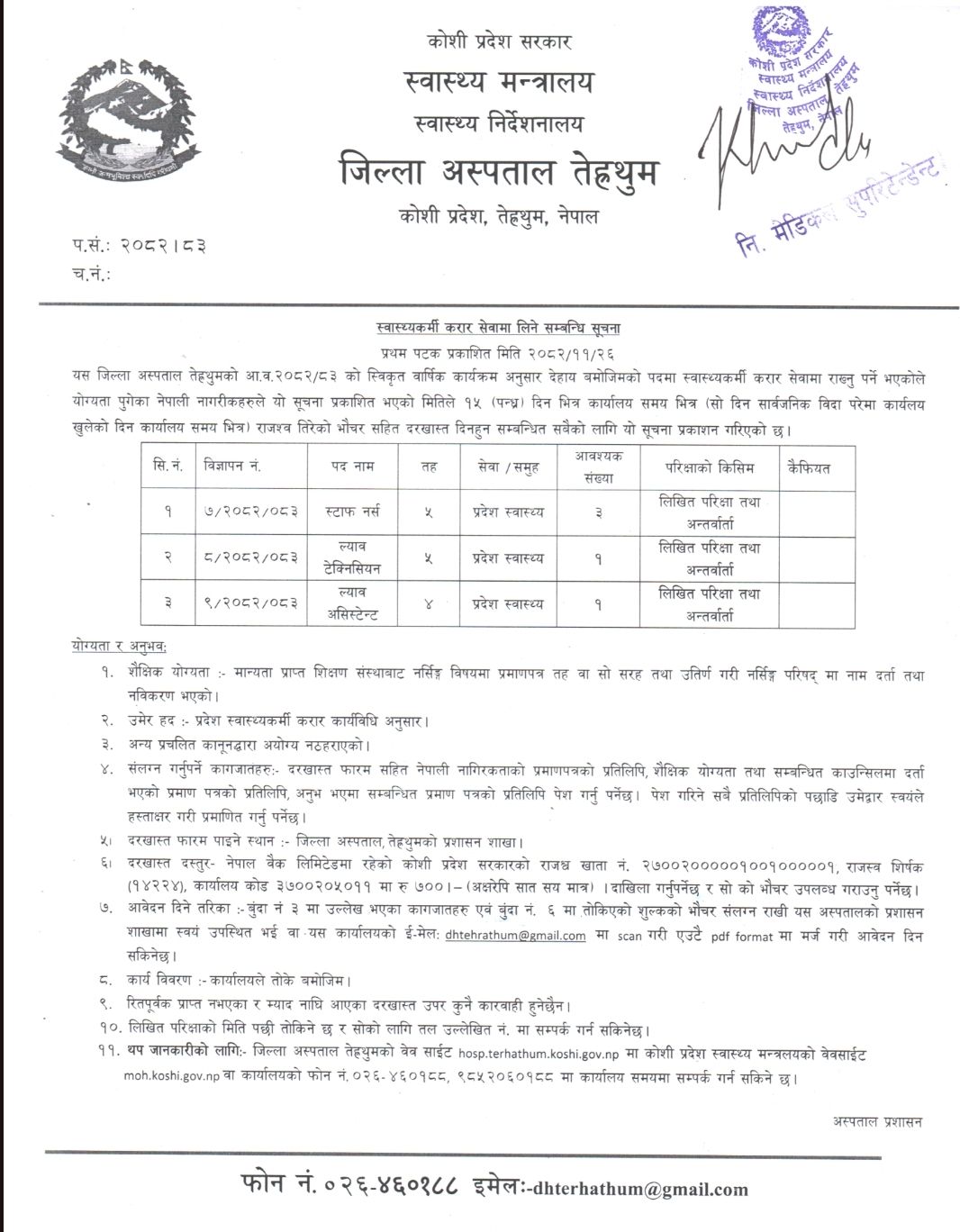 Terhathum District Hospital Vacancies for Staff Nurse, Lab Technician and Lab Assistant