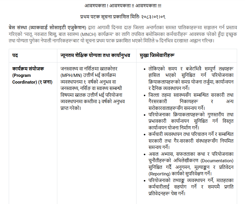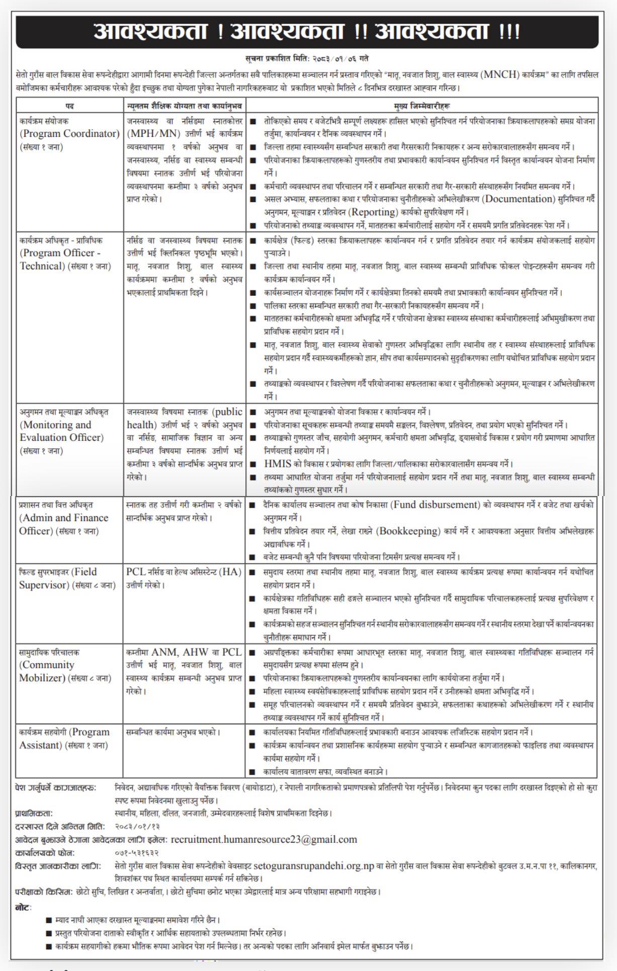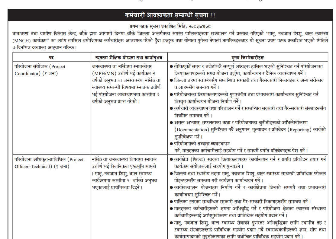 सिरीजङ्घा गाउँपालिका ताप्लेजुङ्गमा Staff Nurse, AHW, ANM आवश्यकता !