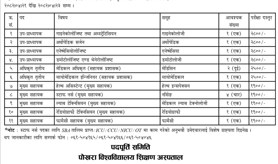 पोखरा विश्वविद्यालय शिक्षण अस्पतालको पदपूर्तिसम्बन्धी सूचना