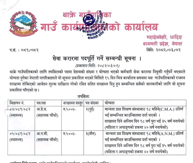 Thakre Rural Municipality Vacancy for AHW and ANM