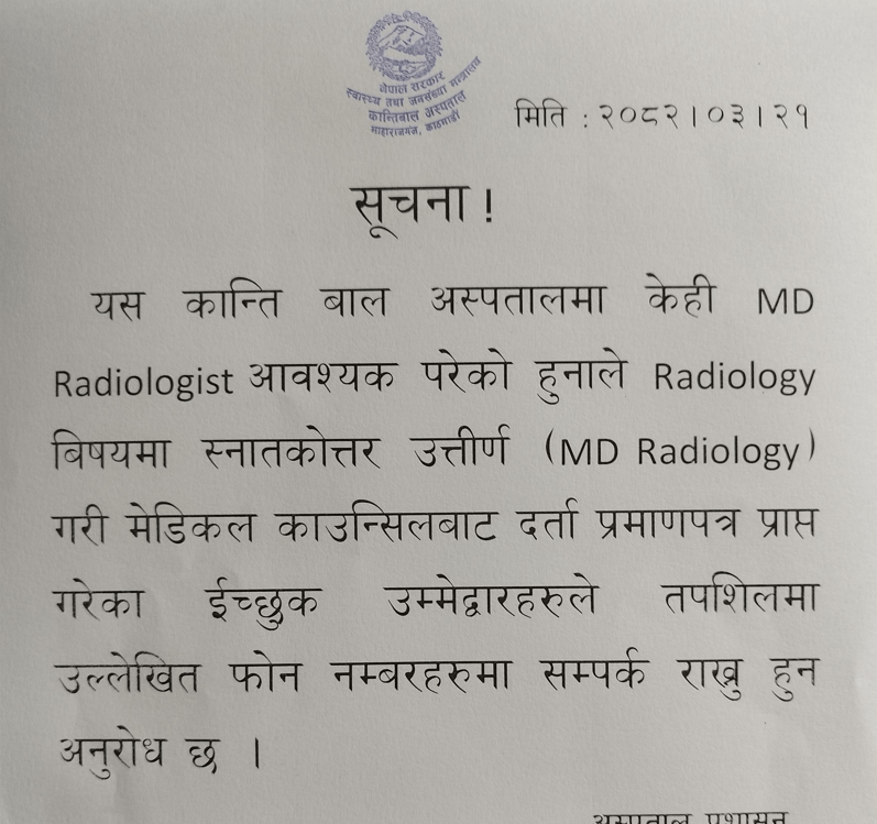 परोपकार प्रसूति तथा स्त्रीरोग अस्पतालमा केहि MD रेडियोलोजीष्ट आवश्यकता