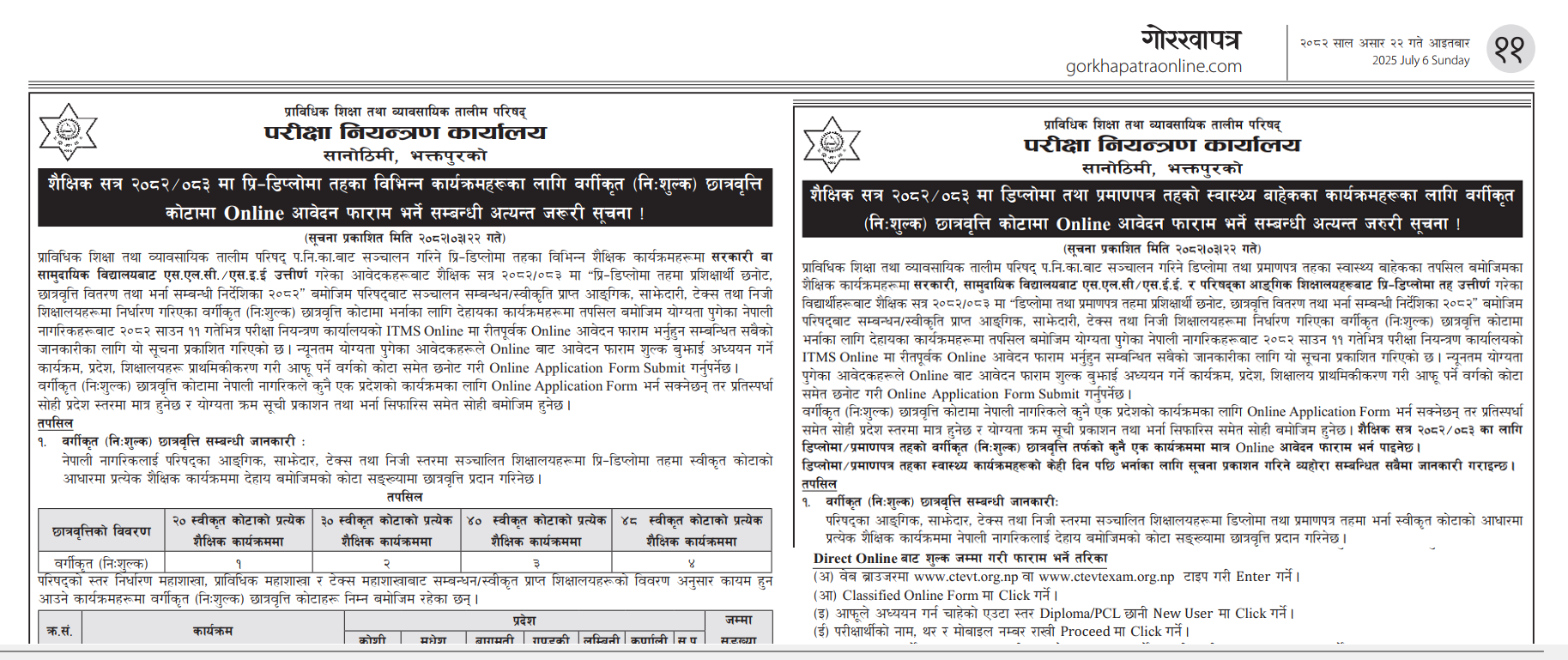 CTEVT को Pre-diploma तथा Diploma तहका स्वास्थ्य बाहेकका विभिन्न कार्यक्रमहरुका लागि वर्गिकृत (निःशुल्क) छात्रवृत्ति कोटामा Online आवेदन फारम भर्ने सम्बन्धी सूचना