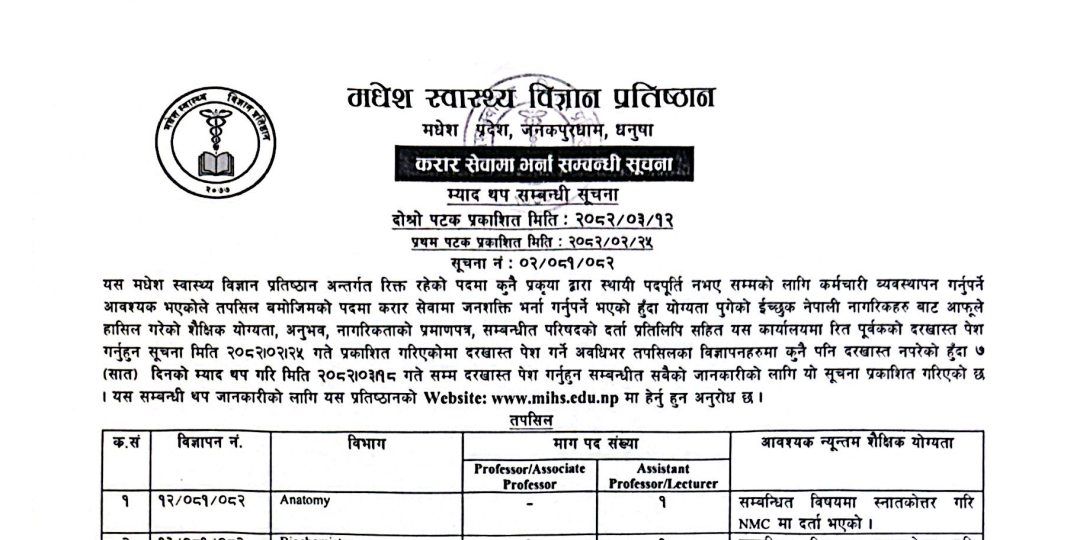मधेश स्वास्थ्य विज्ञान प्रतिष्ठानमा करार सेवामा भर्नाको म्याद थप सम्बन्धी सूचना