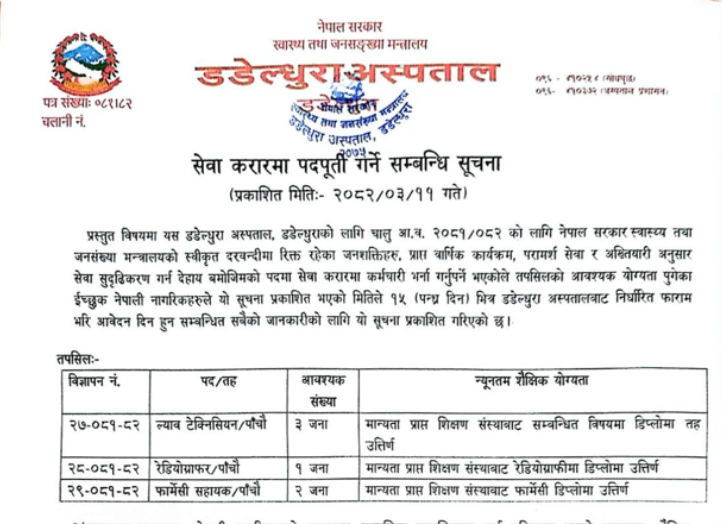 डडेल्धुरा अस्पतालमा सेवा करारमा कर्मचारी पदपुर्ती गर्ने सम्बन्धी सूचना