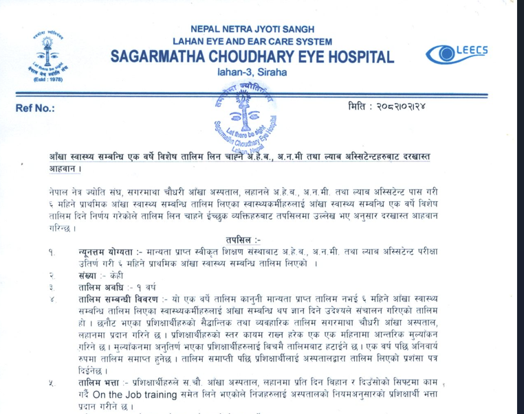 सगरमाथा चौधरी आँखा अस्पतालमा आँखा स्वास्थ्य सम्बन्धि एक वर्षे विशेष तालिम लिन चाहने अ.हे.ब., अ.न.मी. तथा ल्याब अस्सिटेन्टहरुबाट दरखास्त आहवान सम्बन्धी सूचना