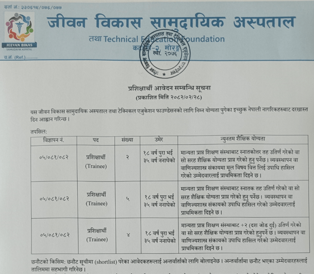 Jeevan Bikas Community Hospital Vacancy for Trainee