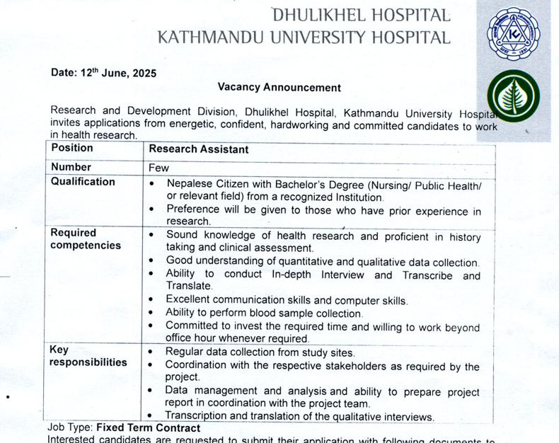 Dhulikhel Hospital Vacancy for the Post of Research Assistant (BPH/BN)