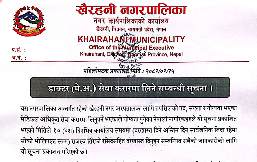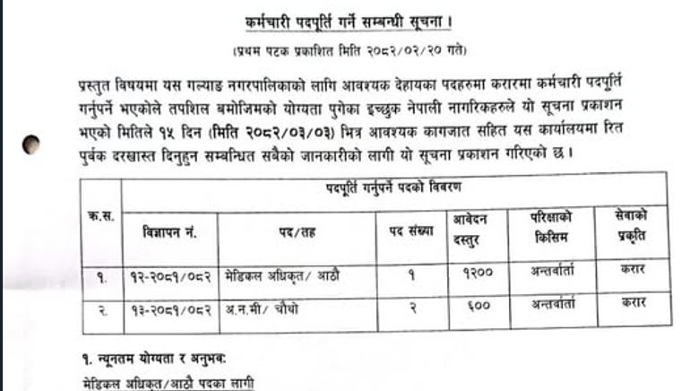 गल्याङ नगरपालिकामा मेडिकल अधिकृत र अ.न.मी. आवश्यकता सम्बन्धी सूचना