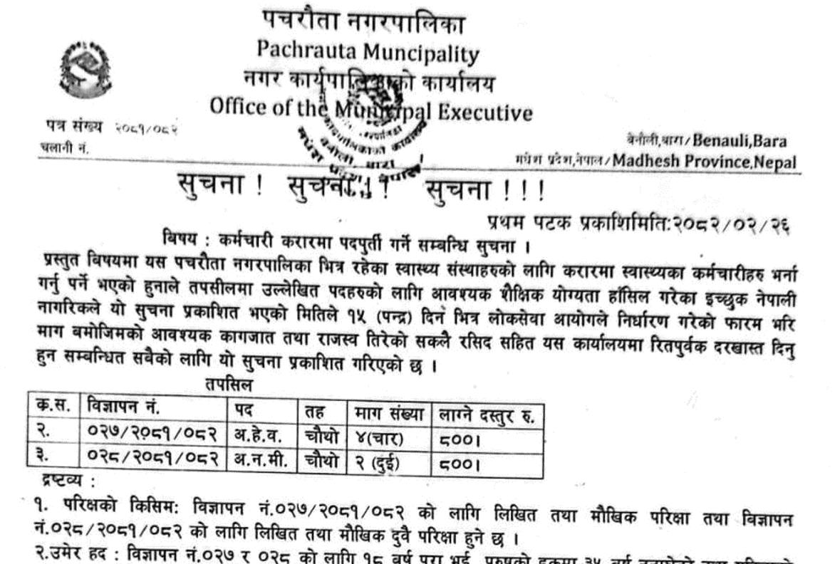 Pachrauta Municipality, Bara Vacancy for ANM and AHW