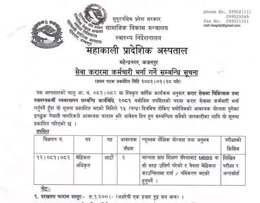 Mahakali Provincial Hospital Vacancy for Medical Officer