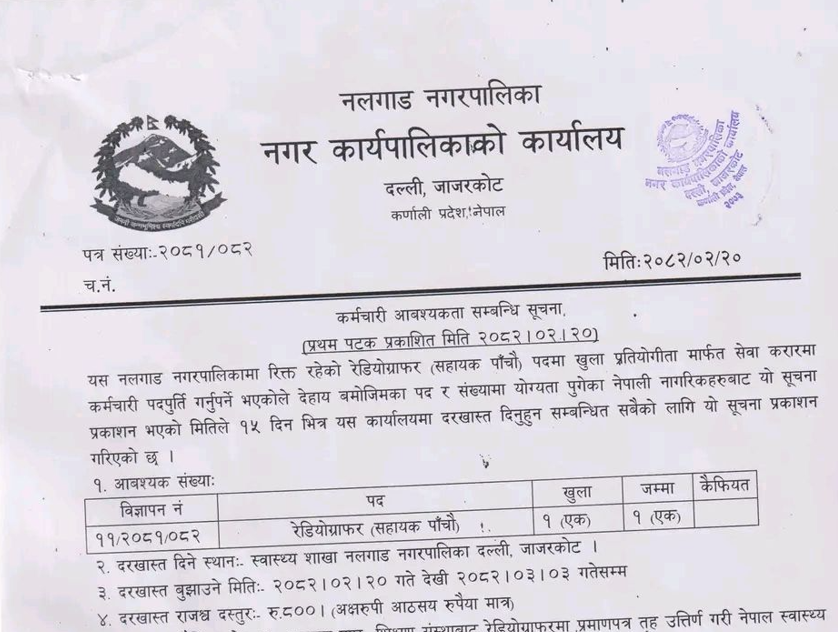 नलगाड नगरपालिका जाजरकोटमा रेडियोग्राफर, सहायक पाँचौ तह कर्मचारी आवश्यकता सम्बन्धि सूचना