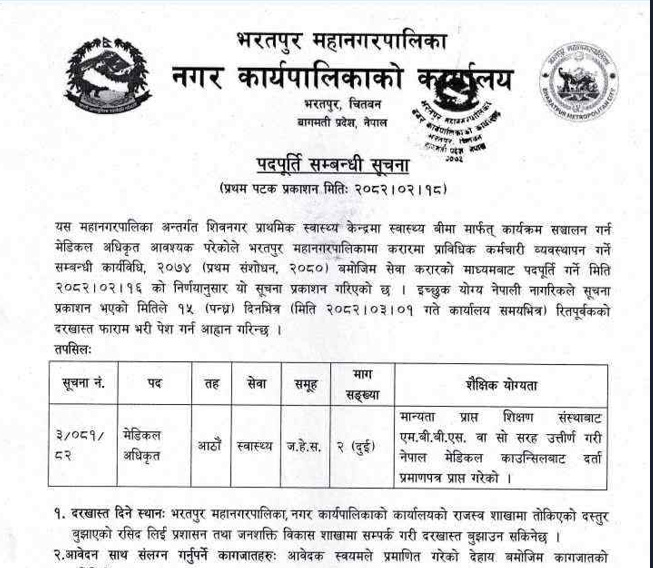 भरतपुर महानगरपालिका चितवनमा मेडिकल अधिकृत आवश्यकता सम्बन्धी सूचना