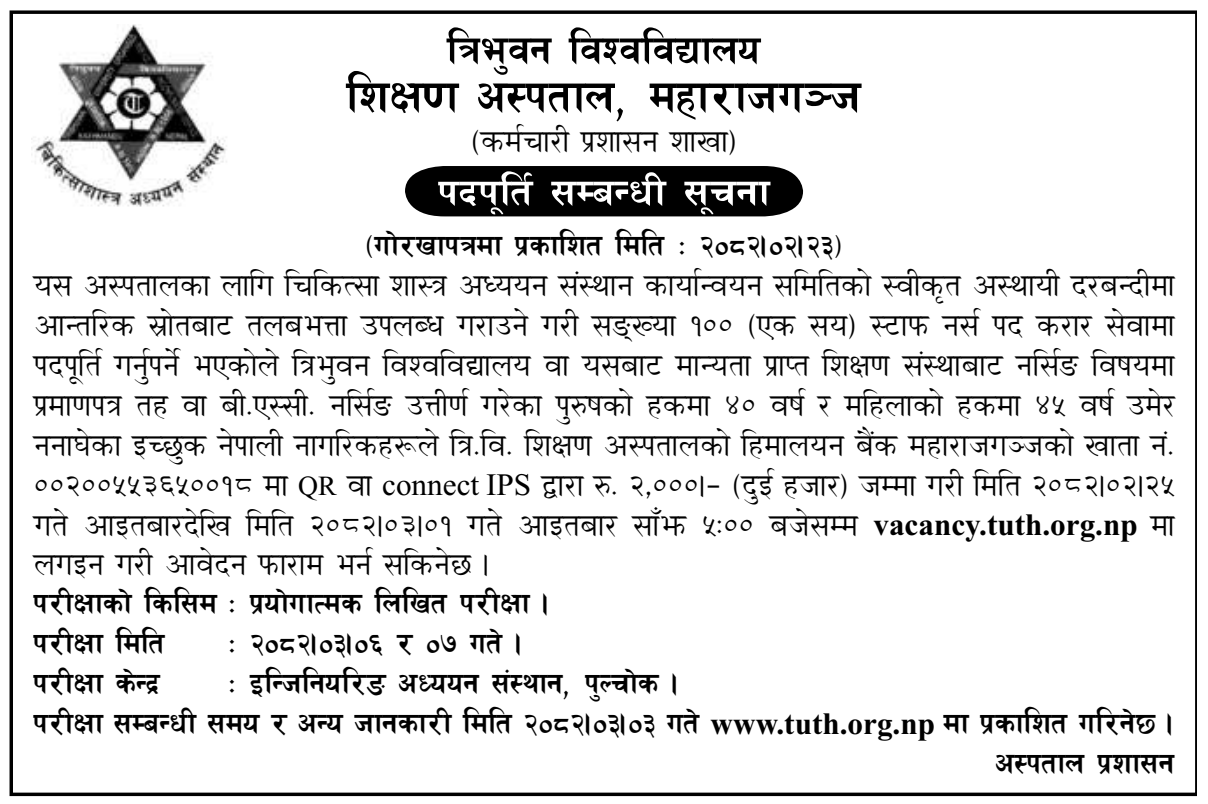 त्रि.वि. शिक्षण अस्पताल महाराजगञ्जमा १०० जना स्टाफ नर्स आवश्यकता सम्बन्धी सूचना