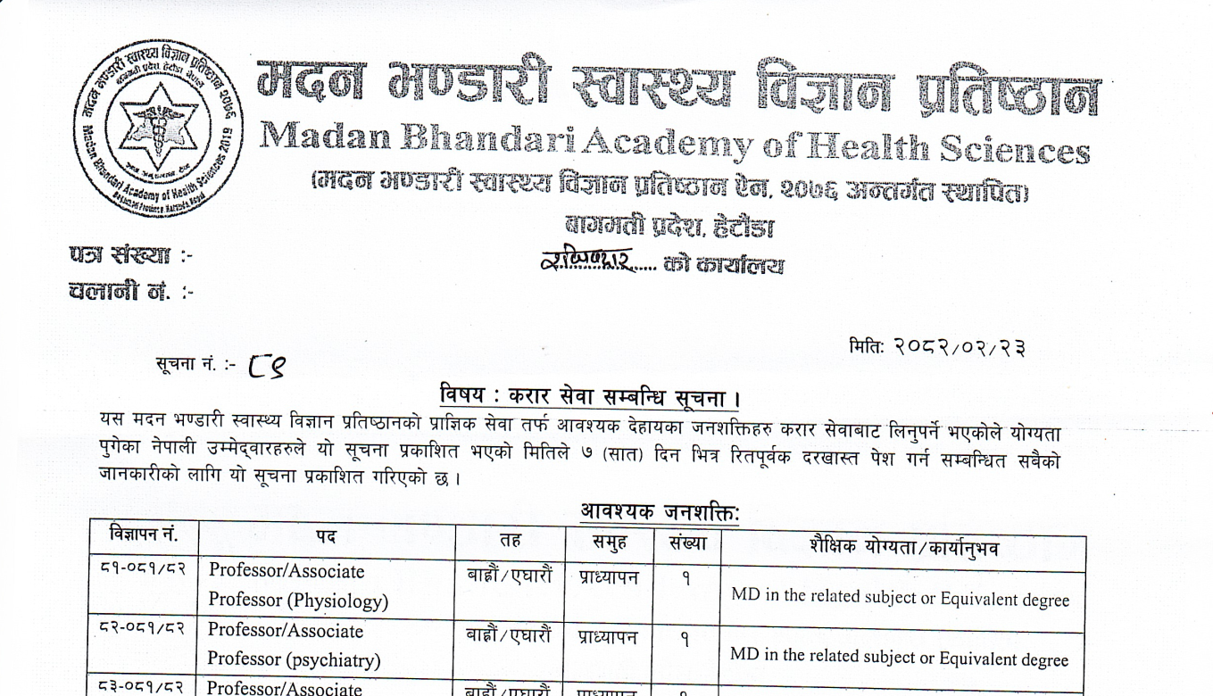 मदन भण्डारी स्वास्थ्य विज्ञान प्रतिष्ठानमा प्राज्ञिक सेवा तर्फ करार सेवामा कर्मचारी आवश्यकता सम्बन्धी सूचना