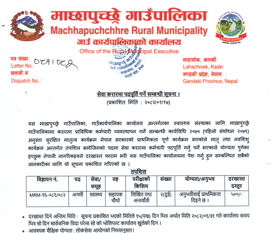 भोटेखोला गाउँपालिकामा कर्मचारी आवश्यकता सम्बन्धी सूचना