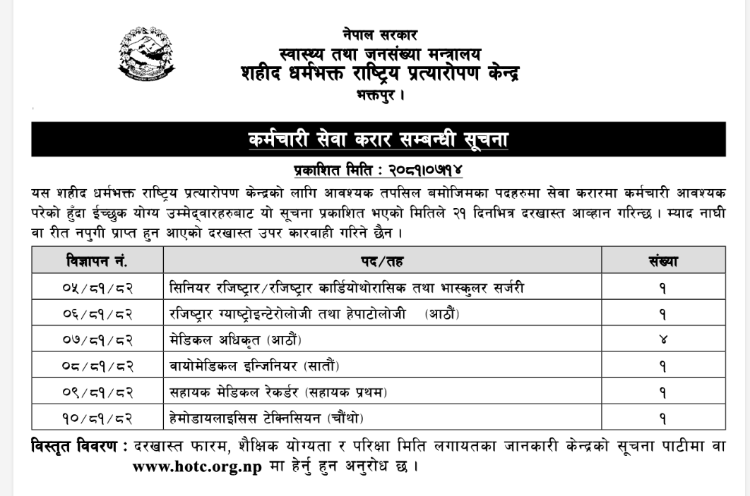 सहिद धर्मभक्त अङ्ग प्रत्यारोपण केन्द्रमा कर्मचारी आवश्यकता सम्बन्धी सूचना