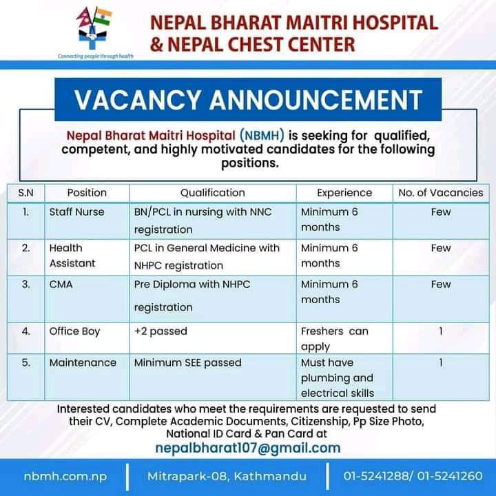 Vacancy Announcement At Nepal Bharat Maitri Hospital And Nepal Chest Centre