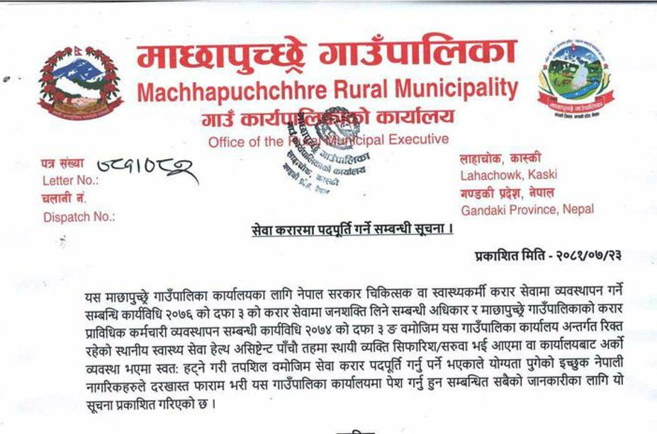 माछापुच्छ्रे गाउँपालिकामा हे.अ. आवश्यकता सम्बन्धी सूचना !