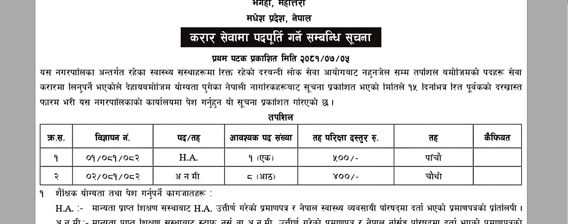 भंगहा नगरपालिकामा ८ जना अ.न.मी. र १ जना हे.अ. आवश्यता सम्बन्धी सूचना