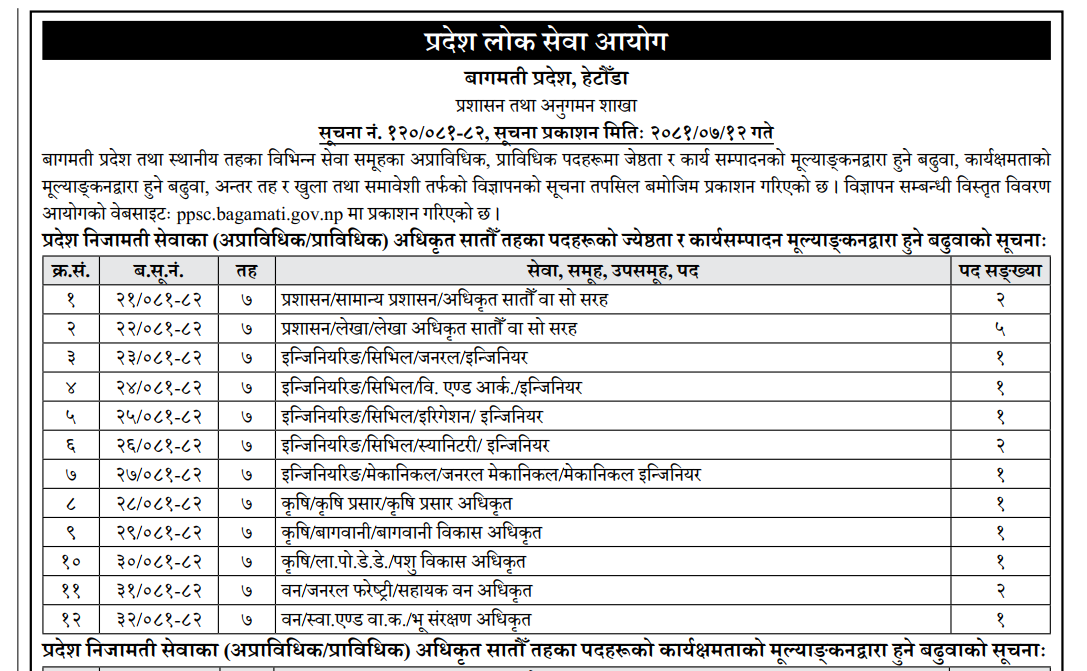 बागमती प्रदेश लोक सेवा आयोगको प्रदेश निजामति तथा स्थानीय सेवाको प्राविधिक तथा अप्राविधिक अधिकृत सातौँ/आठौँ तहका विभिन्न सेवाका पदहरुको विज्ञापन