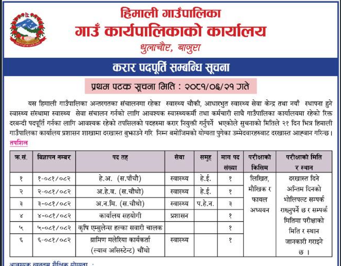 हिमाली गाउँपालिका बाजुराको कर्मचारी आवश्यकता सम्बन्धि सम्बन्धी सूचना