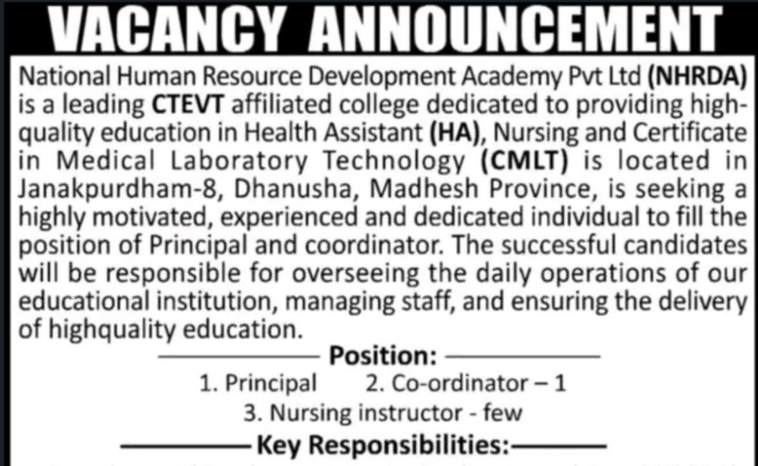 NHRDA Vacancy For Principal, Coordinator And Nursing Instructor