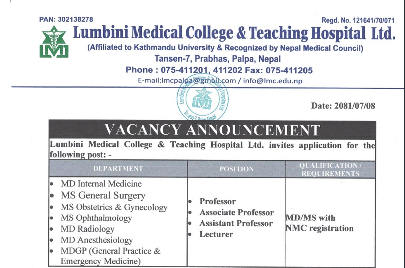 Lumbini Medical College & Teaching Hospital Vacancy For MD, MS, MDGP